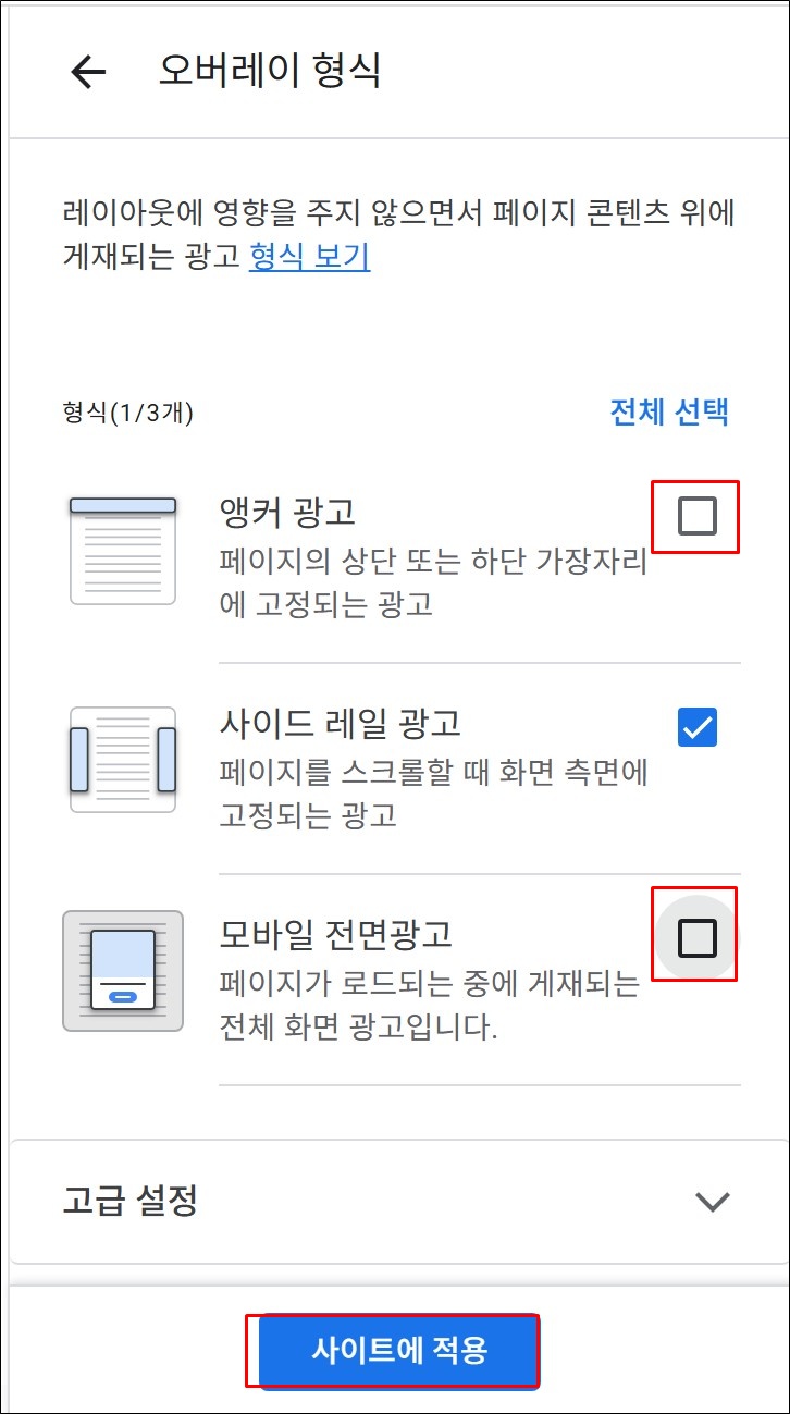 4. 모바일 전면광고에 체크되어 있는 것을 없앤 후(설정 off) "사이트에 적용"을 눌러주세요.