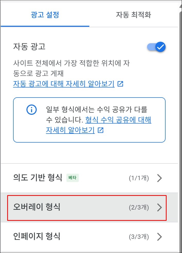 3. 광고 설정에서 [오버레이 형식]을 눌러주세요.