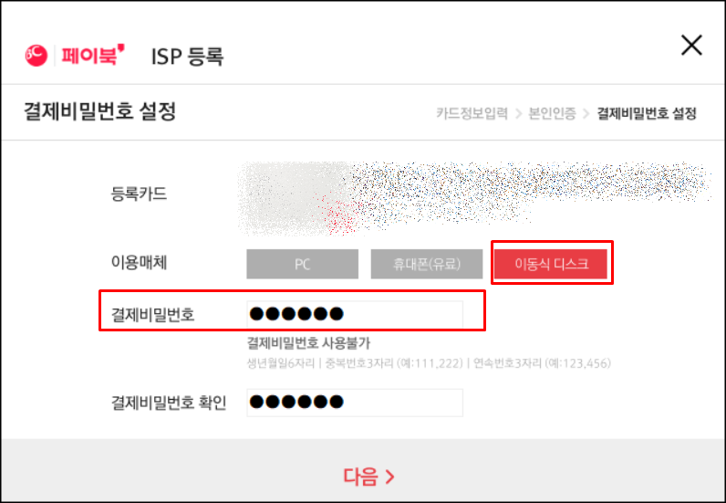 ISP를 등록해 놓으면 결제 시 카드번호 및 유효기간 입력 없이 ISP인증서 비밀번호만으로 결제를 할 수 있습니다.