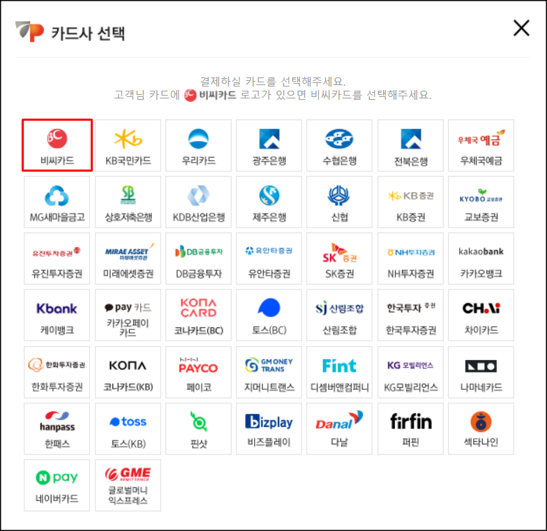 저는 비씨법인카드를 등록하는 거라 비씨카드를 선택했습니다.
