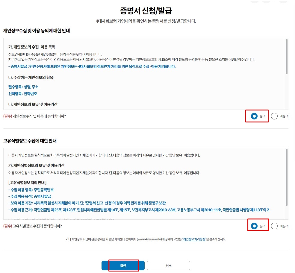 2. 개인정보 수집 및 이용, 고유식별정보 수집 "동의" 후 확인을 눌러주세요.