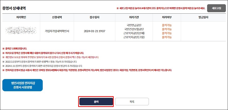 6. 하단에 있는 [출력]을 누르면 "4대 사회보험 가입자 가입내역 확인서"를 출력하거나 저장할 수 있습니다.
